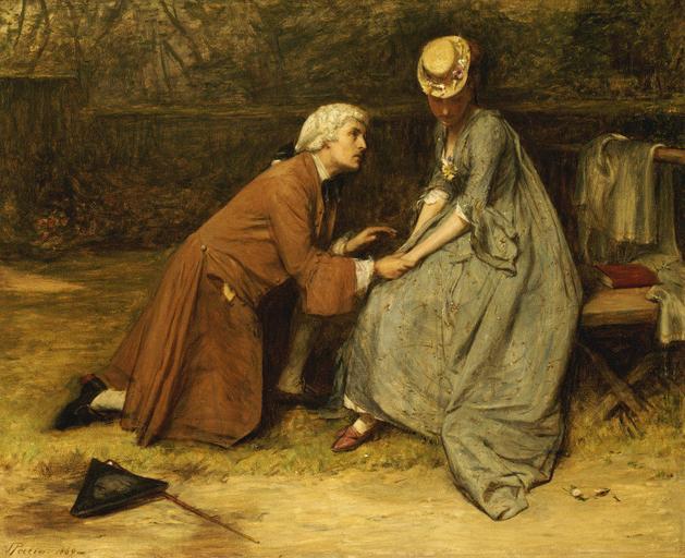 Keywords: Proposal by John Pettie.jpg Artwork Creator John Pettie The Proposal 1869 Oil Canvas cm 47 6 57 8 Private Collection http //www artnet com/artists/john-pettie/the-proposal-PZqBXOezMoCiRRLG43A4vQ2 Victorian genre scene of young man and young woman wearing ca 1780s clothes; one-knee proposal http //www easyart com/canvas-prints/John-Pettie/The-Proposal 2C-1869-213814 html Other versions PD-old-100-1923 John Pettie Marriage proposals in paintings 1896 paintings Rococo revival paintings