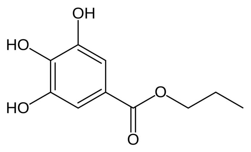 Keywords: Propyl gallate.svg Skeletal formula of propyl gallate Created using http //www acdlabs com/download/chemsk html ACD/ChemSketch 10 0 and Inkscape Own 2007-03-05 Fvasconcellos Antioxidants Propyl esters Gallate esters