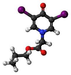 Keywords: Propyliodone-3D-balls.png Ball-and-stick model of the propyliodone molecule an X-ray contrast agent Colour code 505050 Carbon C black<br> F0F0F0 Hydrogen H white<br> F51E1E Oxygen O red<br> 3C50FA Nitrogen N blue<br> 961496 Iodine I purple<br> 2011-02-03 own DS Visualizer Jynto talk Space-filling version cc-zero Iodine containing contrast agents Dihydroazines Cyclic ketones Carboxylate esters Propyl esters Images by Jynto |