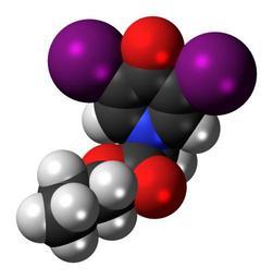 Keywords: Propyliodone-3D-spacefill.png Space-filling model of the propyliodone molecule an X-ray contrast agent Colour code 505050 Carbon C black<br> F0F0F0 Hydrogen H white<br> F51E1E Oxygen O red<br> 3C50FA Nitrogen N blue<br> 961496 Iodine I purple<br> 2011-02-03 own DS Visualizer Jynto talk Ball-and-stick version cc-zero Iodine containing contrast agents Dihydroazines Cyclic ketones Carboxylate esters Propyl esters Images by Jynto |