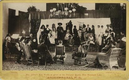 Keywords: Prospect House in Blue Mountain Lake, New Yorkjpg.jpg The image shows men and women posed on a makeshift stage in the parlour of the Prospect House in Blue Mountain Lake New York A number of well-dressed men and women sit in chairs facing the stage The hotel's chandelier hangs in front of the valance curtain Prospect House was situated at the foot of Blue Mountain on a point of land jutting out into Blue Mountain Lake The six-story 300-room Prospect House opened in 1882 It had many modern conveniences that other hotels in the area did not have such as a steam-powered elevator http //postalpicture blogspot com br/2012/01/on-with-show html ~ 1882 Creator Albert Bierstadt PD-old-100 Albert Bierstadt |