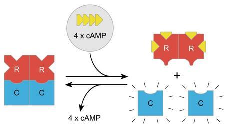 Keywords: Proteinkinase 1.svg en a sketch of activation effects of cAMP on Protein Kinase A own David W 2009-10 Activation effects of cAMP on Protein Kinase A jpg Protein kinase A