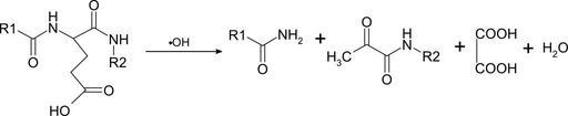 Keywords: Proteinoxidation 02.svg Proteinoxidation Polypeptidstrangbruch durch die Oxidation eines Glutaminrestes durch reaktive Sauerstoffspezies Protein oxidation Fragmentation by oxidation of glutamic acid own derived from E R Stadtman und R L Levine Chemical modification of proteins by reactive oxygen species In Redox Proteomics From Protein Modifications To Cellular Dysfunction And Diseases ' I Dalle-Donne A Scaloni und A Butterfield Editors Wiley Interscience Series on Mass Spectrometry 2006 ISBN 0-471-72345-2 p nsp;45 See also R Widmer http //opus kobv de/tuberlin/volltexte/2007/1504/ Wirkung von Hemmstoffen und Antioxidantien in Gliazellen bei Anoxie/Reoxygenierung und in der hepatischen Enzephalopathie Dissertation TU Berlin 2007 2010-01-17 Kuebi Armin Kübelbeck Protein degradation |