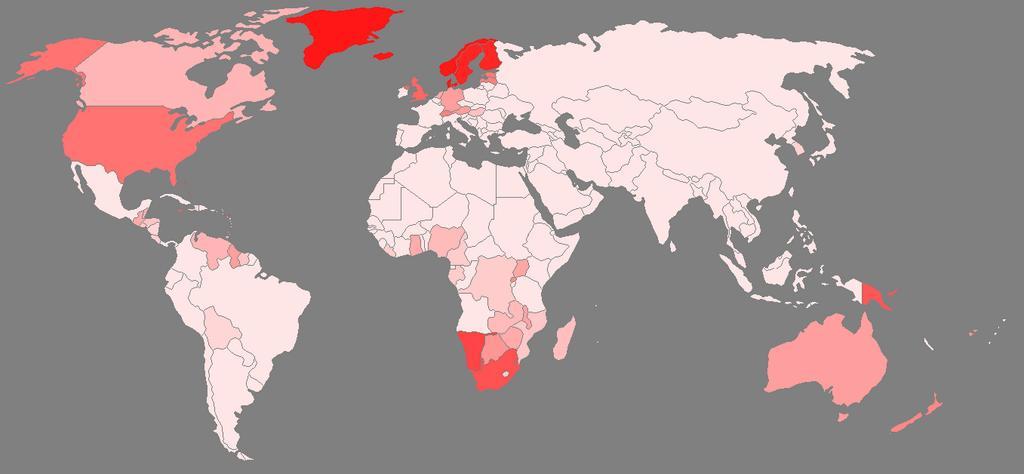 | Keywords: Protestentism world map.png  Prevalence of protestantism by country Countries with 16 or more protestants are marked The scale is HSV 0/P/100 where P is the percentage of Protestants E g Denmark 0/91/100 RGB ff1717 USA 0/55/100 RGB ff7373 Data is based on the US State Department's International Religious Freedom Report 2004 adherents com and the CIA Factbook via this image which only lists the 60 countries with the highest percentage of protestants Rank 60 is Haiti with 16 All other countries with a fraction lower than that of Haiti are shown with a generic background colour fo HSV 0/10/100 ffe6e6 These countries could be given better resolution in future updates of the map ff1919 90 ff3333 80 ff4d4d 70 ff6666 60 ff8080 50 ff9999 40 ffb3b3 30 ffcccc 20 ffe6e6 15 or less Protestentism_By_Country_Percent png 2011-03-10 14 33 UTC Protestentism_By_Country_Percent png User Electionworld derivative work Dbachmann <span class signature-talk >talk</span> Sliding scale HSV palette Dbachmann Protestentism_By_Country_Percent png Original upload log This image is a derivative work of the following images File Protestentism_By_Country_Percent png licensed with PD-user 2006-12-04T19 38 15Z Electionworld 1357x628 96311 Bytes <nowiki> en ThrashedParanoid Based on US State Department's International Religious Freedom Report 2004 Adherents com and the CIA Factbook Licensing ThrashedParanoid Categor</nowiki> Protestant distribution maps of the world Maps needing South Sudan political boundaries |