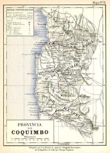 Keywords: Provincia de Coquimbo-1885.jpg Mapa de la antigua Provincia de Coquimbo equivalente a la actual IV Región de Coquimbo Chile hacia 1895 Geografía descriptiva de la República de Chile arreglada según las últimas divisiones administrativas las más recientes esploraciones i en conformidad al censo jeneral de la República levantado el 28 de noviembre de 1895 por Enrique Espinoza Cuarta edición considerablemente aumentada Santiago de Chile Imprenta i Encuadernación Barcelona 1897 1897 F A Fuentes PD PD-Art Old maps of Chile