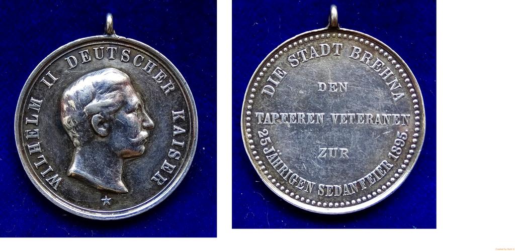 Keywords: Prussian War Veteran Silver Medal Day of Sedan 1895.jpg en D 32 mm 11 41 g Ag Day of Sedan Sedantag was a semi-official memorial holiday in the German Empire celebrated on the second of September to commemorate the victory in the at Battle of Sedan 1870 After the outbreak of the Franco-Prussian War a few weeks later French emperor Napoleon III and his army were taken prisoner in the fortress of Sedan by Prussian troops a major step to eventual victory Wilhelm II Deutscher Kaiser 1888 - 1918 Head r around WILHELM II DEUTSCHER KAISER / 3 lines and around DIE STADT BREHNA DEN TAPFEREN VETERANEN ZUR 25 JÄHRIGEN SEDANFEIER 1895 Brehna is a small town now in Saxony-Anhalt Germany In 1895 it belonged to the Kingdom of Prussia Condition VERY FINE original loop 1895-09-02 own Berlin-George other versions cc-by-sa-4 0 This photo PD-1923 PD-EU-no author disclosure Wilhelm II of Germany on medals 1920 medals Medals of Germany Sedantag |