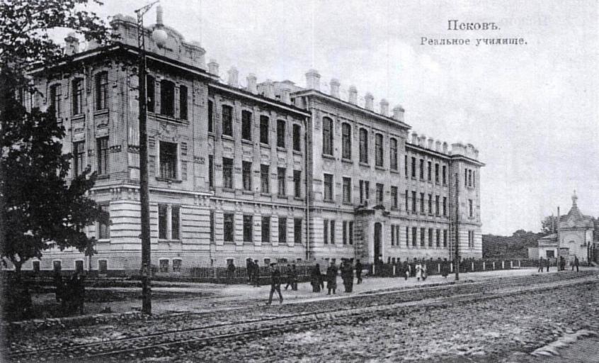 Keywords: Pskov Realschule.jpg Псковское еальное училище ул Се гиевская начало XX века http //www pskovrail ru/novosti/tramway_pskov_kazarmy_utschilitsche html turn of the decade 1910 author PD-RusEmpire Pskov