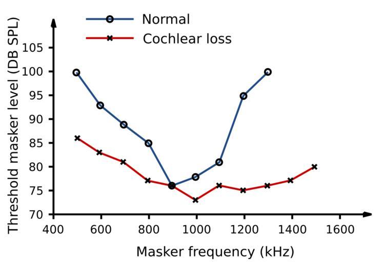 | Keywords: Psychoacoustical tuning curves.svg en To generate a psychoacoustical tuning curve choose any frequency and lower the amplitude such that the subject can barely detect it ~2dB above threshold This probe tone will be intermittent Then the masker tone is presented at a different frequency and increase the amplitude as high as possible such that the subject can still detect the probe tone Repeat the process for multiple frequencies and derive your line graph Here we see two psychoacoustical tuning curves - one for a normal cochlea and one for a cochlea with damaged outer hair cells Notice that the damaged cochlea is both less sensitive the line is lower and less selective the curve is not sharp Thus to restore hearing in someone with outer hair cell damage simple amplification is not enough since that raises inaudible indistinguishable sounds to the level of audible indistinguishable sounds The selectivity problem needs to be solved to have useful hearing Own Inductiveload 2009-02-15 SVG files on otology Sensory Neuroscience Hearing and speech |