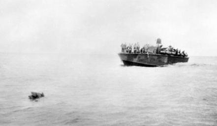 Keywords: PT boat at Milne Bay 1943.jpg A U S Navy PT boat from the PT base on the southeastern shore of Milne Bay at Kona Kope approaches a makeshift buoy and an oil slick in north eastern Milne Bay which marks the last resting place of A16-245 a 6 Squadron RAAF Lockheed Hudson which was ditched by pilot 415152 Flt Lt Ray Kelly after poor weather delayed the aircraft long enough for it to run out of fuel 60 kilometres from base After watching their plane sink after it floated for five minutes and spending 15 minutes in the water the crew of four were rescued by locals in lakatois outrigger canoes and eventually picked up by the PT Boat and taken to the Asheville class patrol gunboat USS Tulsa PG-22 P03901 010 1943-02-24 Australian armed forces Image copyright Copyright expired - public domain frame cropped PD-Australia PT boats Milne Bay Province Pacific War in February 1943 New Guinea campaign |