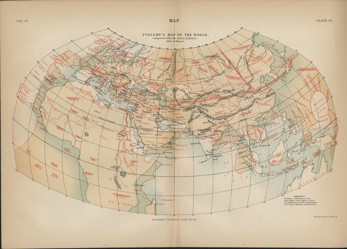| Keywords: Ptolemy's Map of the World Compared with the Actual Positions.jpg en A world map on Ptolemy's second projection with the geographical information from Ptolemy's Geography in red and 19th-century corrections in black Dotted lines show displacements according to H Kiepert's identifications 1883 <s>http //www allposters com/-sp/Ptolemy-s-Map-of-the-World-Shown-in-Red-True-Locations-in-Black-Posters_i2876140_ htm All Posters</s> http //www ebay com/itm/ptolemys-ancient-map-of-the-world-authentic-1889-map-britannica-/130893094394 eBay derived from Vol XV Plate VII in the Encyclopaedia Britannica 9th ed N/A other versions <gallery> File EB9 Vol XV Pl VII Ptolemy's Map of the World png File EB9 Vol XV Pl VII Ptolemy's Map of the World jpg </gallery> PD-US PD-Britannica PD-100 Images from the Encyclopædia Britannica 9th ed Volume XV Ptolemy's second projection 1883 1883 maps W A K Johnston Alexander Keith Johnston 1804 “1871 1880s maps of the world |