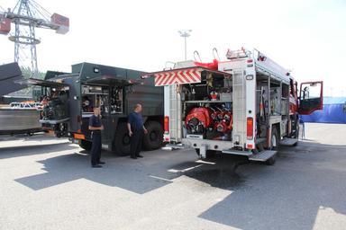 | Keywords: Pujo puhdistusajoneuvo ja SM11 sammutusajoneuvo 2.JPG en Pujo puhdistusajoneuvo chemical warfare decontamination vehicle and SM11 fire engine used by Finnish military Pujo is based on Scania Saurus 6x6 fire engine with 279 kW engine and weight of 23930 kg Equipped with Esteri D-240 pump and Rosenbauer R15E water cannon with tank capacity of 4800 liters hydraulic winch Warn 12 capacity 5 4 metric tons and ordinary fire engine equipment Additional equipment include high pressure pumps and cleaners emulsion tank and a decontamination tent with shower Primary function as a decontamination vehicle but can be used as an ordinary fire engine in peace time SM11 is a Scania P380 CB 4x4 Saurus 28 fire engine 279 kW engine weight 17280 kg Esteri D-240 pump Rosenbauer R8E water cannon 1000 l/min/10 bar with 2800 liter tank capacity 15 KVA emergency generator water rescue equipment and Warn 12 hydraulic winch with 5 4 metric ton capacity fi Suomen puolustusvoimien käyttämä Pujo kemiallisen sodankäynnin puhdistusajoneuvo ja SM11 paloauto Pujo on rakennettu Scania Saurus 6x6 paloauton alustalle 279 kW moottorilla ajoneuvon painon ollessa 23930 kg Varustuksena Esteri D-240 pumppu ja Rosenbauer R15E vesitykki joille yhteensä 4800 litran vesisäiliöt Warn 12 5 4 t hydraulivinssi ja normaali sammutusauton pelastuskalusto Puhdistukseen korkeapainepumppu ja -pesurit sekä emulsiosäiliö ja puhdistusteltta lämminvesisuihkulla Päätehtävänä ihmisten ja ajoneuvojen puhdistaminen kemiallisista aineista toimii myös sammutus- ja pelastusajoneuvona SM11 on keskiraskas sammutusauto Scania P380 CB 4x4 Saurus 28 279 kW moottori ajoneuvon paino 17280 kg Varustuksena Esteri D-240 pumppu Rosenbauer R8E vesitykki 1000 l/min/10 bar ja 2800 litran vesisäiliö 15 KVA n varavoimageneraattori pintapelastuskalusto Warn 12 5 4 tonnin hydraulivinssi sekä normaali sammutusauton pelastuskalusto own MKFI 2011-07-09 Finnish Navy anniversary 2011 PUJO decontamination vehicle Military fire engines of Finland Scania fire engines Scania P380 Taken with Canon EOS 60D Taken with Canon EF-S 15-85mm F3 5-5 6 IS USM Files by User MKFI |