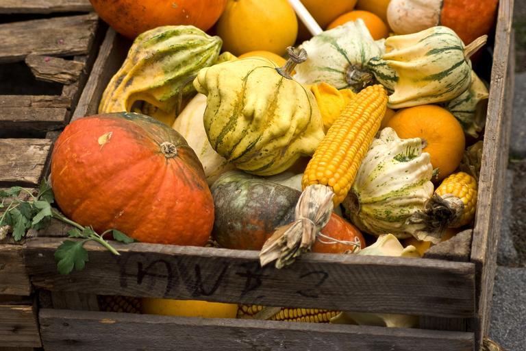 Keywords: pumpkins corn decoration harvest autumn fall october yellow orange seasonal rustic wooden box rural country farm colorful