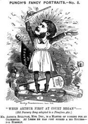 Keywords: Punch - Sullivan's knighthood.png Cartoon from Punch It was printed with the following short article A HUMOROUS KNIGHT <small> It is reported that after the Leeds Festival Dr Sullivan will be knighted Having read this in a column of gossip a be-nighted Contributor who has the Judge's Song on the brain suggests the following verse adapted to probabilities </small> As a boy I had such a musical bump And its size so struck Mr H<small>ELMORE</small> That he said Though you sing those songs like a trump You shall write some yourself that will sell more So I packed off to Leipsic without looking back And returned in such classical fury That I sat down with H<small>ANDEL</small> and H<small>AYDN</small> and B<small>ACH</small> ” And turned out Trial by Jury But W S G he jumped for joy As he said Though the job dismay you Send Exeter Hall to the deuce my boy; It's the haul with me that'll pay you And we hauled so well mid jeers and taunts That we've settled spite all temptations To stick to our Sisters and our Cousins and our Aunts ” And continue our pleasant relations Yet I know a big Duke and I've written for Leeds And I think I don't wish to be snarly If honour's poured out on a chap for his deeds I'm as good ”come as M<small>ONCKTON</small> or C<small>HARLEY</small> So the next first night and the OpĂ©ra C Let's hope if you're able to find him You'll cry from the pit There's W S G In the stalls ”with a K<small>NIGHT</small> behind him ' Punch or the London Charivari 1880-10-30 Edward Linley Sambourne 1844-1910 PD-old-100 Edward Linley Sambourne Punch magazine cartoons Arthur Sullivan Music in 1880 1880 cartoons |