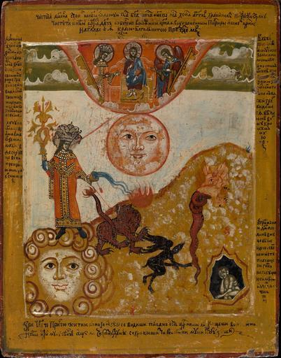 | Keywords: Pure Soul (North Russia, 17-18 c., priv.coll).jpg  A RARE ICON OF THE PURE SOUL NORTHERN RUSSIA END OF THE 17TH TO BEGINNING OF THE 18TH CENTURY 49 by 37 5 cm 15 000-20 000 GBP Allegorical depictions of Pure and Sinful Souls are known in Russian art from the latter half of the 16th century often in illustrated manuscripts commemorating the dead necrologies Judging from the unusual white background the artist replicated a miniature from a book The Pure Soul is depicted on the left as the Virgin in real attire and wearing a crown adorned with flowers To her right is a lion anger a serpent sin and on the right squatting naked in a cave is the devil symbolising the sinful soul Christ enthroned in heaven above awaits the worship of the Pure Soul and Guardian Angel At the centre is the Sun with a human face and the border texts explain what is depicted In the 18th-19th centuries edifying works about the Pure and Sinful Soul were in demand amongst Old Believers both icons and printed sheets incorporated texts from either a necrology or the Blessed Monk Dorotheus's Thirty Great and Original Virtues which formed part of the Tsvetnik Flower-bed a book widely popular with Old Believers It is in the latter where the deep meaning of this edifying subject finds its fullest expression Human purity attaches man to God and the purity of God dwells in man Tsvetnik of the Blessed Monk Dorotheus Grodno 1790 p 187 An important distinction of this icon is that the detailed border inscriptions bear no relation to either literary sources Addressing the viewer ” an extremely rare feature in an icon ” the lower border reads See O man the parable of life painted here if thou wilt ascend to the heavenly kingdom then preserve thy purity of soul otherwise thou shalt suffer eternal torment Given the rarity of the subject and the detailed original text this icon is of considerable interest and belongs to a particular edifying type of Old Believer icon painting http //macdougallauction com/Indexx1211 asp id 524 lx a END OF THE 17TH TO BEGINNING OF THE 18TH CENTURY RusIcon Icons of Pure Soul Files uploaded by Shakko from various sources MacDougall's Fine Art Auctions Icons of Russian North PD-old |