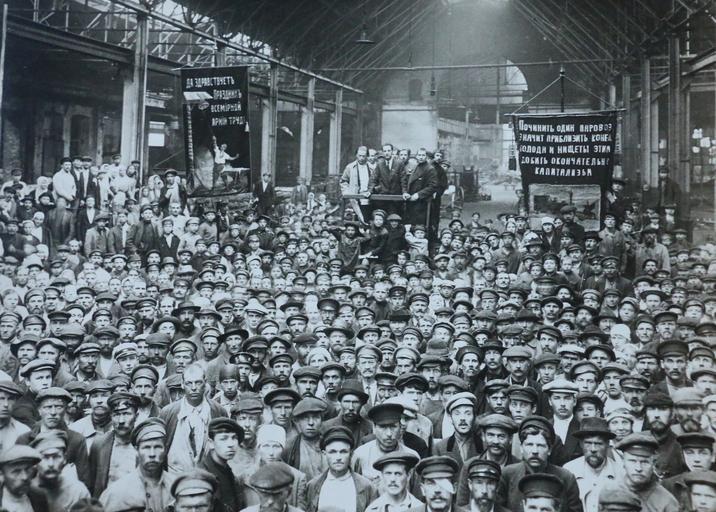 | Keywords: workers 20th century 20thcentury soviet union sovietunion boris souvarine borissouvarine russia putilov meeting elections petrograd saint-petersburg saintpetersburg 1920 july 1920 july1920 Boris Souvarine Papers - Soviet Russia Photos graduateinstitute.ch/home/research/library/archives/boris... Notes: The back of this picture holds the mention (in Russian and French) "New elections to the Petrograd soviet at the Putilov factory, after the report by Comrade Glebov-Putilovskii, July 1920"). This legend may designate Nikolaï Glebov-Avilov (1887-1937). A Bolshevik leader arrested during a strike at Putilov factory in 1912, he took a part in the February Revolution, and became and active representative of the Bolsheviks in Petrograd, involved in factories issues. The left banner reads: "Long live the Party of the universal Army of Labour"; one can see a worker ringing a bell. The right banner reads: "To create a locomotive means to bring close to the end hanger and misery, as well as to give a final blow to capitalism". Unknown photographer. Description: 1 photograph. Black and white ; 11 x 15 cm. Sources and further reading: Siegelbaum, Lewis H. 1992. Soviet State and Society between Revolutions, 1918-1929. Cambridge: Cambridge University Press. Boris Souvarine Papers - Soviet Russia Photos graduateinstitute.ch/home/research/library/archives/boris... Notes: The back of this picture holds the mention (in Russian and French) "New elections to the Petrograd soviet at the Putilov factory, after the report by Comrade Glebov-Putilovskii, July 1920"). This legend may designate Nikolaï Glebov-Avilov (1887-1937). A Bolshevik leader arrested during a strike at Putilov factory in 1912, he took a part in the February Revolution, and became and active representative of the Bolsheviks in Petrograd, involved in factories issues. The left banner reads: "Long live the Party of the universal Army of Labour"; one can see a worker ringing a bell. The right banner reads: "To create a locomotive means to bring close to the end hanger and misery, as well as to give a final blow to capitalism". Unknown photographer. Description: 1 photograph. Black and white ; 11 x 15 cm. Sources and further reading: Siegelbaum, Lewis H. 1992. Soviet State and Society between Revolutions, 1918-1929. Cambridge: Cambridge University Press. |