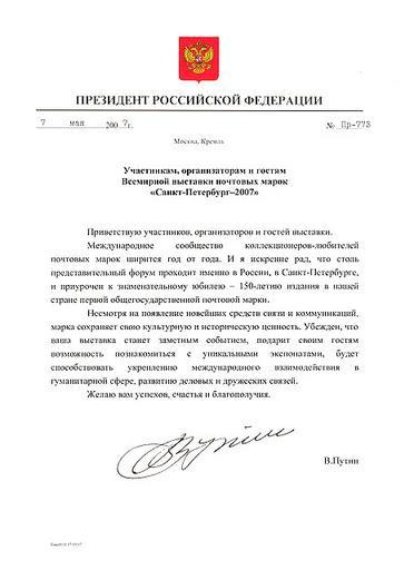 | Keywords: Putin Addresses St Petersburg Stamp Expo 2007.jpg en An official letter by Vladimir Putin in which he addresses the World Philatelic Exhibition «St Petersburg-2007» Signed on May 7 2007 ru Официальное п иветствие кото ое П езидент Российской Феде ации В Путин нап авил в ад ес участников о ганизато ов и гостей Всеми ной выставки почтовых ма ок «Санкт-Пете бу г 2007» Дати овано 07 05 2007 http //www russianpost ru/worldstamp/worldstamp/ru/home/press/greetings/greeting1 Presidential Press and Information Office 2007-05-07 PD-RU-exempt Vladimir Putin in 2007 20070121 Philatelic exhibitions Exhibitions in 2007 Exhibitions in Saint Petersburg |
