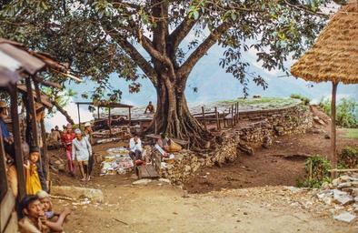| Keywords: batti chautara commerce community tea shop teashop nepal outdoor tree plant Date: 1968 Location: Dhankuta, Dhankuta Description: Gumounni Chautara (round resting spot). The trail from Dharan to Dhankuta crossed the first ridge of hills and descended to the Tamur river and crossed at Mulghat. Half way up the hill from Mulghat to Dhankuta Bazaar is a chautara with two large pipel (ficus) trees. Chautaras form welcome resting spots and the trees provide welcome shade. Date: 1968 Location: Dhankuta, Dhankuta Description: Gumounni Chautara (round resting spot). The trail from Dharan to Dhankuta crossed the first ridge of hills and descended to the Tamur river and crossed at Mulghat. Half way up the hill from Mulghat to Dhankuta Bazaar is a chautara with two large pipel (ficus) trees. Chautaras form welcome resting spots and the trees provide welcome shade. |