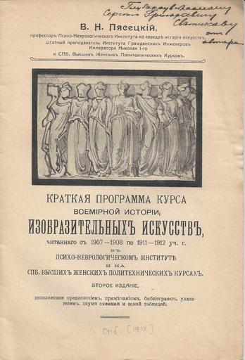 Keywords: Pyasetsky Title Autograph.jpg en The title page of the book К аткая п ог амма ку са всеми ной исто ии изоб азительных искусств by V N Pyasetsky with the dedicatory inscription to Sergei Svatikov 1880 1942 the historian and political figure ru Титульный лист б ошю ы К аткая п ог амма ку са всеми ной исто ии изоб азительных искусств с да ственной надписью В Пясецкого Се гею Г иго ьевичу Сватикову 1880 1942 оссийскому исто ику и общественному деятелю The family archive Vladimir Nikolayevich Pyasetsky 1868-1934 1912 Pyasetsky Vladimir Nikolayevich PD-old |
