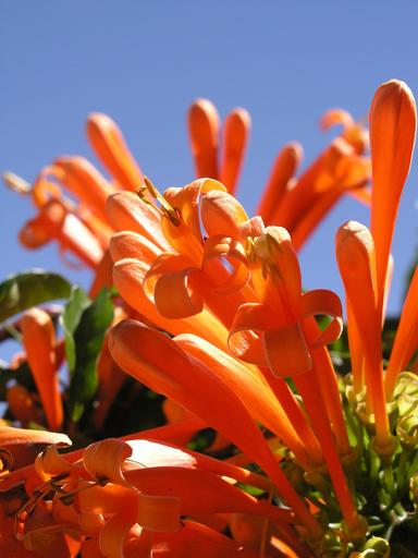 Keywords: pyrostegia orange flower trumpet bloom blossom venusta colorful fire garden flora fauna summer spring leaf bright blue sunny petal botany botanical natural plant green vivid vibrant vine