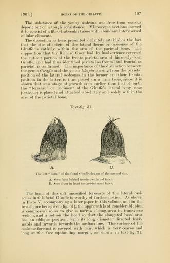 | Keywords: PZSL1907Page107.png Giraffa camelopardalis antiquorum ™‚ × G c wardi ™ Giraffa camelopardalis antiquorum <small>Swainson 1835</small> ™‚ × G c giraffa <small>von Schreber 1784</small> ™ foetus en Left horn of hybrid giraffe foetus Kordofan Giraffe male × South African Giraffe female from behind left and forward right Recovered at about 350 days of gestation two-third term from mother which died in London Zoo on May 5 1906 Proceedings of the Zoological Society of London http //archive org/details/proceedingsofzoo19071446zool vol 1907 issue 1 http //archive org/stream/proceedingsofzoo19071446zool page/107/mode/1up page 107 1907 E Ray Lankester text PD-old <gallery> File PZSL1907Plate05 png Same specimen head from above File PZSL1907Page106 png Same specimen partially dissected head from right lateral File PZSL1907Page108 png Same specimen pattern of hairs between horn bases File PZSL1907Page112 png Same specimen skull from right lateral File PZSL1907Page115 png Same specimen head from left lateral File PZSL1907Page116 png Same specimen section of skin between horn bases File PZSL1907Page117 png Same specimen section of skin of forehead File PZSL1907Page118 png Same specimen pattern of hairs on forehead </gallery> PZSL 1907-1 1906 Giraffa camelopardalis hybrid foetus from London Zoo Giraffa camelopardalis horns |