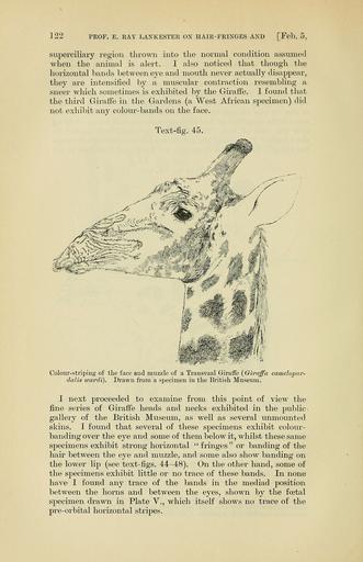 | Keywords: PZSL1907Page122.png Giraffa camelopardalis wardi Giraffa camelopardalis giraffa <small>von Schreber 1784</small> en Head of South African Giraffe specimen in Natural History Museum from left lateral Proceedings of the Zoological Society of London http //archive org/details/proceedingsofzoo19071446zool vol 1907 issue 1 http //archive org/stream/proceedingsofzoo19071446zool page/122/mode/1up page 122 1907 E Ray Lankester text PD-old <gallery> File PZSL1907Page123 png Same specimen showing direction of hair growth </gallery> PZSL 1907-1 Giraffa camelopardalis giraffa head Collections of the Natural History Museum London |