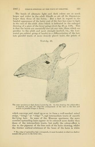 | Keywords: PZSL1907Page123.png Giraffa camelopardalis wardi Giraffa camelopardalis giraffa <small>von Schreber 1784</small> en Head of South African Giraffe specimen in Natural History Museum from left lateral Coloration is ignored to emphasize direction of hair growth Proceedings of the Zoological Society of London http //archive org/details/proceedingsofzoo19071446zool vol 1907 issue 1 http //archive org/stream/proceedingsofzoo19071446zool page/123/mode/1up page 123 1907 E Ray Lankester text PD-old <gallery> File PZSL1907Page122 png Same specimen showing coloration </gallery> PZSL 1907-1 Giraffa camelopardalis giraffa head Collections of the Natural History Museum London Animal hair |