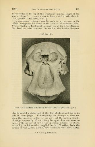 | Keywords: PZSL1907Page401.png Elephas africanus oxyotis Loxodonta africana <small> Blumenbach 1797 </small> en Skull of adult African Bush Elephant shot by A Haig in northeastern Africa and presented to Natural History Museum from frontal Proceedings of the Zoological Society of London http //archive org/details/proceedingsofzoo19071446zool vol 1907 issue 2 http //archive org/stream/proceedingsofzoo19071446zool page/401/mode/1up page 401 1907 Butterworth PD-old PZSL1907Page401 extracted png PZSL 1907-2 |