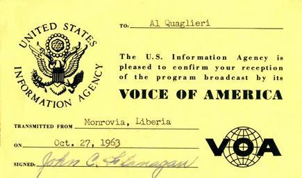 | Keywords: QSL VOA Monrovia-1963.jpg en QSL card confirming a reception report for a Voice of America broadcast aired via Monrovia Liveria https //www flickr com/photos/alcue/14810433372/ Voice of America signed by John C Flanagan 1963-10-27 PD-USGov-VOA Voice of America QSL cards |
