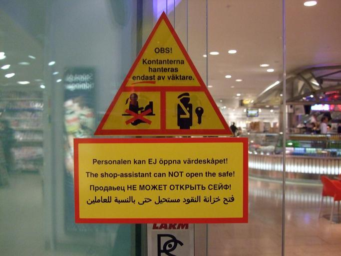 | Keywords: Quadrilingual store sign - 2008-01-31 (gabbe).jpg Fyrspråkig butiksskylt placerad vid entrén till en Presstopbutik i Gallerian i Stockholm Quadrilingual store sign located on the entrance to a Presstop-store in Gallerian in Stockholm I Gabriel Ehrnst Grundin took this with my own camera on January 31 2008 2008-01-31 Gabbe The subject of the image the quadrilingual sticker is not creative enough to be subject to copyright and I reject any claim to copyright on the picture itself In other words the image is in the public domain The text of the sign is messagebox style clear both; border 5px solid f00; background-color yellow text-align center; width 60px; Swedish Personalen kan EJ öppna värdeskåpet <br/> English The shop-assistant can NOT open the safe <br/> Russian П одаьец Е ОЖЕТ ОТКРЫТЬ СЕЙФ <br/> Arabic فتح خزانة النقود مستحيل حتى بالنسبة العاملين PD-Sweden-self Multilingual signs Yellow triangles Multilingual warning signs Signs in Stockholm Black red yellow signs |