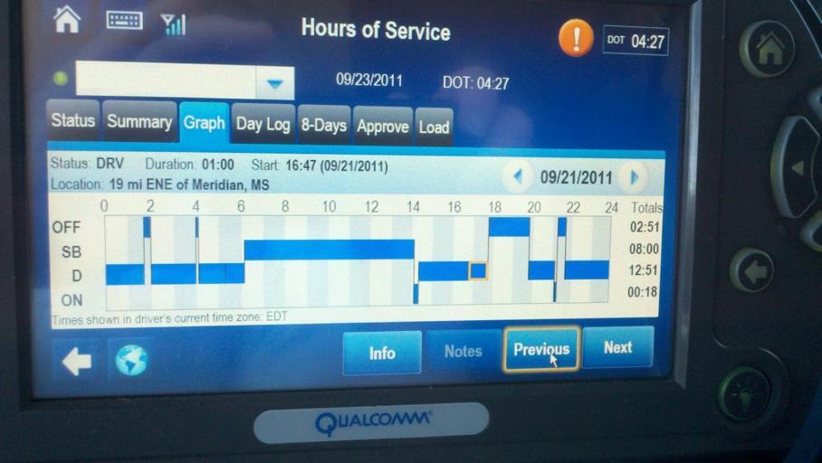 Keywords: Qualcomm EOBR model MCP110 September 2011.png Uploaded with en wp UW marker 2012 07 07 This is an electronic on board recording device also described as an EOBR for monitoring the hours of service HOS of a professional drivers daily routine Installed into a common carriers vehicle for automatically recording the time a driver is moving or at rest This type of device would normally take the place of a driver recording his own hours of service via a paper log book It can also be referred to as paperless logs I took this photo inside the truck that I drive 2011-09-23 Semi Sam Semi Sam GFDL cc-by-sa-3 0 redundant Uncategorized 2015 March 22 |