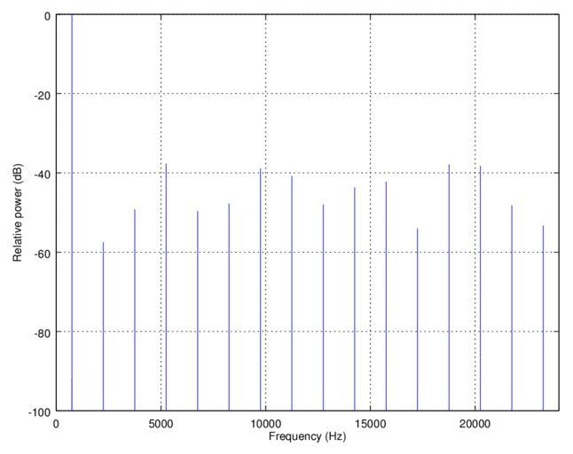 | Keywords: Quantization nodither noshaping spectrum.png en Spectrum of a 750 Hz pure tone sampled at 48 kHz and quantized to 4 bits using neither dither nor noise shaping <pre> quantization_nodither_noshaping m Quantization demo using neither dither nor noise shaping Authors Fatbag License Public domain no warranties rand 'state' 0xdeadbeef ; f_s 48000; sampling rate samples/sec f0 750; frequency of sine wave Hz t_s 1/f_s; sampling period sec/sample w0 2 pi f0; angular frequency of sine wave Hz t 0 4095 t_s; x round 15 sin w0 t ; figure 1; plot t 1 ceil 2 f_s/f0 x 1 ceil 2 f_s/f0 ; axis 0 ceil 2 f_s/f0 t_s -20 20 ; grid on; xlabel 't' ; ylabel 'x t ' ; figure 2; X fft x 1 4096 ; X X 1 2048 ; m 20 log10 arrayfun norm X ; m - max m ; m ~isfinite m -1000; f 0 2047 /2048 f_s/2; plot f m ; axis 0 f_s/2 -100 0 ; grid on; xlabel 'Frequency Hz ' ; ylabel 'Relative power dB ' ; print 'quantization_nodither_noshaping_spectrum_uncropped png';</pre> 2015-11-13 own Andrew D'Addesio other versions cc-zero Digital audio Quantization Uploaded with UploadWizard |