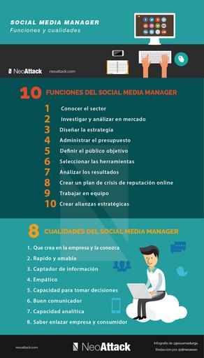 | Keywords: marketing online social media redes sociales manager gestor contenidos twitter facebook pinterest instagram tumblr flirckr snapchat screenshot text neoattack.com/social-media-manager-toda-la-informacion-so...  SOCIAL MEDIA MANAGER: CUALIDADES, TAREAS Y COMO SER UNO  Antes de comenzar, con qué hace el Social Media Manager y comentar sus funciones, cualidades y como llegar a ser uno me gustaría es necesario aclarar algunas cuestiones que suelen surgir a las empresas y profesionales en torno a este tema. Todo sobre el Social Media Manager ¿Si soy una pequeña empresa necesito un Social Media Manager?   Sí. Necesitas un Social Media Manager porque al igual que trazaste una estrategia para tu empresa necesitarás trazar una estrategia para las redes sociales. Si no trazas una estrategia y analizas los resultados tus acciones serán dispares y no sabrás con exactitud qué tipo de acciones funcionan mejor o si los objetivos que propusiste los has alcanzado.   ¿Social Media Manager es lo mismo que Community Manager?   No. El Social Media Manager se encargar de la estrategia y el Community Manager del trabajo de campo. Es decir, el Social Media Manager creará el Plan Social Media (analizará el entorno, distribuirá el presupuesto, fijará los objetivos, elegirá las redes sociales en las que estar , etc.) para que se cumplan los objetivos, analizará los resultados y cambiará lo que sea necesario en la estrategia para que estos se cumplan y el Community Manager realizará todas las acciones que se establecieron en la estrategia para lograr cumplir los objetivos.   que es un social media manager   ¿Qué es un Social Media Manager?   “Un Social Media Manager es aquel encargado de trazar estrategia y analizar los resultados y un Community Manager es quien lleva a cabo las acciones para conseguir los alcanzar planteados en la estrategia” ¿Puedo hacer yo de Social Media Manager?   Un día un amigo al que nunca le había gustado la carpintería decidió construir un armario. Este tardó 10 veces más de lo que hubiese tardado un carpintero y encima el armario no quedo del todo bien, teniendo finalmente que comprar otro porque al poco tiempo ya estaba cogeando y las baldas se movían.   El intentar hacerlo él mismo le supuso una pérdida enorme de tiempo además de tener que gastar el doble del presupuesto que tenía previsto para aquel armario. A partir de entonces nunca más lo dudó. Cada profesión tiene sus expertos y si no tienes unos conocimientos medios o has hecho un curso de carpintería, mejor que no te pongas a construir armarios.   ¿Cómo ser Social Media Manager?   En el caso de que quieras ser Social Media Manager, lo que te aconsejo es que hagas algún curso respaldado por una gran empresa en la que sepas que vas a obtener los conocimientos necesarios para ejercer la profesión correctamente. Infórmate y fórmate antes de buscar un puesto de trabajo de este estilo.   Si estás buscando formación, unas buenas escuelas especializadas en formación Social Media son Aula CM y Adveischool pero existen muchas otras también muy buenas. Para asegurarte de que la formación que te imparten es la suficiente para poder ejercer la profesión, asegurate de que el curso incluye todas las funciones que mencionamos más adelante.   que hace un social media manager   QUE HACE UN SOCIAL MEDIA MANAGER Las funciones de un Social Media Manager son muy importantes ya que de él dependerá no solo gran parte de la estrategia de comunicación online de la empresa, sino que también que las tareas realizadas por el Community Manager sirvan para algo.   Social Media Manager funciones   Conocer del sector: El Social Media Manager debe conocer el sector de la empresa para poder ejercer mejor el resto de funciones. Investigar y analizar el mercado: Investigaciones de mercado, elaboración de análisis interno y externo y dafo para tener una visión objetiva y global de la empresa. Diseñar la estrategia: Es el encargado de diseñar la estrategia social media y de crear el Social Media Plan de la empresa, que estará en coherencia y perfectamente alieado con el business plan y los objetivos generales de la empresa. Entre otras, deberá tener en cuenta en su estrategia: Campañas promocionales, concursos, publicidad en redes, eventos, lanzamiento de productos, etc. Estrategia de contenido, forma de comunicar, calendario de contenido, horas de publicación,etc. Administrar el presupuesto: Controlar y administrar el presupuesto así como las distintas partidas para cada una de las acciones a realizar en redes sociales. Definir el publico objetivo: Definir el público objetivo al que estarán dirigidas cada una de las campañas y acciones que se realicen. Seleccionar las herramientas: Seleccionar qué herramientas y apps utilizar para llevar a cabo las tareas y la medición de análisis de resultados. Analizar los resultados: Definir y controlar social media KPIs, conversiones y ROI. Análisis de reportes del Community Manager para medir la eficacia y modificar estrategias en caso de ser necesario. Crear un plan de crisis de reputación online: El Social Media Manager deberá diseñar el manual de gestión de crisis de reputación online de la empresa. Trabajar en equipo: Trabajar codo a codo con el cliente y con los distintos departamentos de la empresa, para analizar los resultados y plantear mejoras estratégicas: Relaciones Públicas, Marketing, Producto, Ventas, Directorio. Crear alianzas estratégicas: Trabajar en el desarrollo de alianzas estratégicas dentro del sector de social media para acciones futuras que puedan reforzar el crecimiento de las comunidades y de la marca. Hasta aquí entonces, es lo que podemos decir que es propio de un SMM, lo cual deja para el Community Manager a rasgos generales, la misión de construir, gestionar y administrar una comunidad en las distintas plataformas de social media, con el objetivo de establecer y sostener una relación duradera y recípro