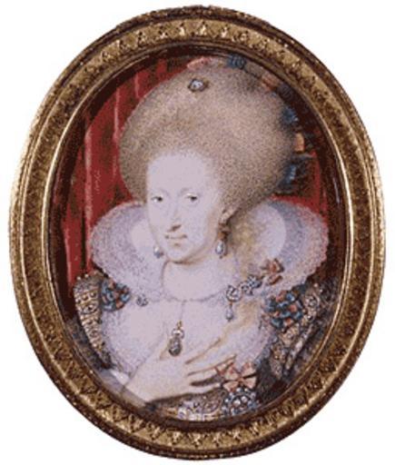 | Keywords: stuart english royalty englishroyalty portrait 16th century 16thcentury 17th century 17thcentury scotland united kingdom unitedkingdom britain people plate indoor Anne of Denmark (12 December 1574 – 2 March 1619) was queen consort of Scotland, England, and Ireland as the wife of King James VI and I.[1]  The second daughter of King Frederick II of Denmark, Anne married James in 1589 at the age of fourteen and bore him three children who survived infancy, including the future Charles I. She demonstrated an independent streak and a willingness to use factional Scottish politics in her conflicts with James over the custody of Prince Henry and his treatment of her friend Beatrix Ruthven. Anne appears to have loved James at first, but the couple gradually drifted and eventually lived apart, though mutual respect and a degree of affection survived.[2]  In England, Anne shifted her energies from factional politics to patronage of the arts and constructed a magnificent court of her own, hosting one of the richest cultural salons in Europe.[3] After 1612, she suffered sustained bouts of ill health and gradually withdrew from the centre of court life. Though she was reported to have died a Protestant, evidence suggests that she may have converted to Catholicism at some stage in her life.[4]  Historians have traditionally dismissed Anne as a lightweight queen, frivolous and self-indulgent.[5] However, recent reappraisals acknowledge Anne's assertive independence and, in particular, her dynamic significance as a patron of the arts during the Jacobean age. Anne of Denmark (12 December 1574 – 2 March 1619) was queen consort of Scotland, England, and Ireland as the wife of King James VI and I.[1]  The second daughter of King Frederick II of Denmark, Anne married James in 1589 at the age of fourteen and bore him three children who survived infancy, including the future Charles I. She demonstrated an independent streak and a willingness to use factional Scottish politics in her conflicts with James over the custody of Prince Henry and his treatment of her friend Beatrix Ruthven. Anne appears to have loved James at first, but the couple gradually drifted and eventually lived apart, though mutual respect and a degree of affection survived.[2]  In England, Anne shifted her energies from factional politics to patronage of the arts and constructed a magnificent court of her own, hosting one of the richest cultural salons in Europe.[3] After 1612, she suffered sustained bouts of ill health and gradually withdrew from the centre of court life. Though she was reported to have died a Protestant, evidence suggests that she may have converted to Catholicism at some stage in her life.[4]  Historians have traditionally dismissed Anne as a lightweight queen, frivolous and self-indulgent.[5] However, recent reappraisals acknowledge Anne's assertive independence and, in particular, her dynamic significance as a patron of the arts during the Jacobean age. |