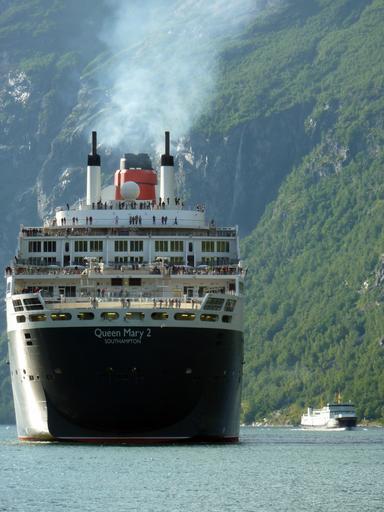 Keywords: queen mary ii cruise ship ship holiday cruise cruises geirangerfjord fjord norway large small sea shipping exhaust gases