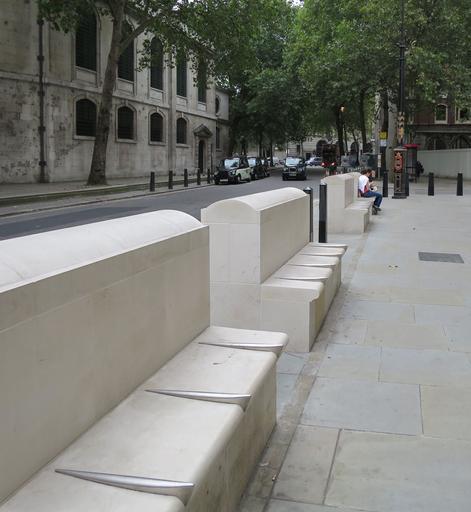 Keywords: bench street benches streetbenches royal courts of justice royalcourtsofjustice the strand thestrand aldwych holborn london wc2 londonwc2 st clement danes stclementdanes street furniture streetfurniture setha low sethalow alex andreou alexandreou ocean howell oceanhowell defensive architecture defensivearchitecture ══════════════════════════════════ NOTE: I've updated the comment below to add material on an article and a radio interview by Alex Andreou; and a podcast with Setha Low. (February and March 2015) ══════════════════════════════════ Above: Benches outside the Royal Courts of Justice in The Strand London WC2 Portland stone clad benches where you can sit. But probably not sleep because of the metal dividers. They are part of the "security measures around the perimeter of the Royal Courts of Justice". The phrase comes from the report by Westminster City Council on 15 October 2012, which approved this and other measures. "The City’s Barbed Cruelty" But "Defensive Architecture" isn't only about protecting the public courts. Alex Andreou wrote a powerful and thoughtful article about the issue, which deserves to be read carefully. Its title is: "The Anti-homeless spikes: Sleeping rough opened my eyes to the city’s barbed cruelty." The Guardian: 18 February 2015. Here's the link to read the article online or download it. As you might expect from the title, Alex Andreou makes a strong plea against the practice of "designing against" homeless people and its deliberate unkindness. "... from ubiquitous protrusions on window ledges to bus-shelter seats that pivot forward, from water sprinklers and loud muzak to hard tubular rests, from metal park benches with solid dividers to forests of pointed cement bollards under bridges, urban spaces are aggressively rejecting soft, human bodies." But, he says, it's not simply against homeless people. Because we are all damaged by this. "When we make it impossible for the dispossessed to rest their weary bodies at a bus shelter, we also make it impossible for the elderly, for the infirm, for the pregnant woman who has had a dizzy spell. By making the city less accepting of the human frame, we make it less welcoming to all humans. By making our environment more hostile, we become more hostile within it". § Alex Andreou "You’ll Never Live Like Common People". New Statesman 6 March 2013. § Alex Andreou refers to the historian Ocean Howell. Both were interviewed about defensive architecture in a radio programme on 17 March 2015, on CBC Radio Toronto. Setha Low: "A Just City and a Vibrant Public Space" Alex Andreou's Guardian article also references Setha Low of City University New York (CUNY) . Professor Low was interviewed on 21 February 2015 by KCBS Radio San Francisco. Listen to or download a 6 minute podcast here. Here's the final minute. KCBS interviewer : Are there also some other unintended consequences? For example, benches provided for somebody who's elderly. And maybe really just needs to sit down because they're tired? Setha Low : I should be very clear. This kind of defensive architecture is anti-human. It's not just anti-homeless. It's anti-everyone; it's anti-elderly; anti-children. It's really not thinking about trying to build a just city and a vibrant public space. And that the increasing use of architecture - it was very popular in the seventies - and then it went away. And now it's coming back again. It has to do with the cleaning-up and the, sort of, sanitising of our public spaces. And their increasing privatisation. And decisions being made of who should be in those public spaces. These ordinances and changing in rules doesn't just keep away people who are homeless and have no place to go. But also does not provide for youth of colour. And doesn't provide for elderly. Doesn't provide for anyone with disabilities. It has wide ranging impact on the vitality of our public space today. And doesn't bode well for the future." _____________ Oranges and Lemons The building on the left of my photo is the Christopher Wren church of St Clement Danes. Walking past I was disappointed not hear the bells chime the tune of the nursery rhyme "Oranges and Lemons ". Though this is not the only St Clements which claims to be the church mentioned. _______________________________ § Website of St Clement Danes Church. § The nursery rhyme Oranges and Lemons may refer to this church or to St Clements Eastcheap. § The bells of St Clement Danes ring the tune. ══════════════════════════════════ NOTE: I've updated the comment below to add material on an article and a radio interview by Alex Andreou; and a podcast with Setha Low. (February and March 2015) ══════════════════════════════════ Above: Benches outside the Royal Courts of Justice in The Strand London WC2 Portland stone clad benches where you can sit. But probably not sleep because of the metal dividers. They are part of the "security measures around the perimeter of the Royal Courts of Justice". The phrase comes from the report by Westminster City Council on 15 October 2012, which approved this and other measures. "The City’s Barbed Cruelty" But "Defensive Architecture" isn't only about protecting the public courts. Alex Andreou wrote a powerful and thoughtful article about the issue, which deserves to be read carefully. Its title is: "The Anti-homeless spikes: Sleeping rough opened my eyes to the city’s barbed cruelty." The Guardian: 18 February 2015. Here's the link to read the article online or download it. As you might expect from the title, Alex Andreou makes a strong plea against the practice of "designing against" homeless people and its deliberate unkindness. "... from ubiquitous protrusions on window led
