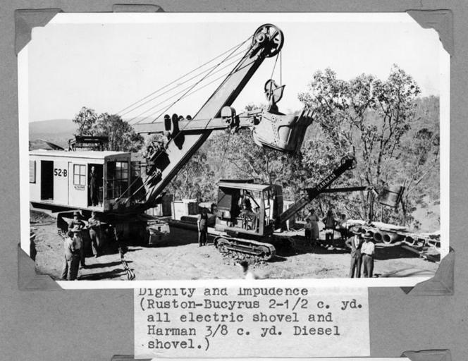 Keywords: Queensland State Archives 4606 Dignity and Impudence RustonBucyrus 212 cyd all electric shovel and Harman 38 cyd Diesel shovel Somerset Dam January 1937.png en Dignity and Impudence Ruston-Bucyrus 2-1/2 c yd all electric shovel and Harman 3/8 c yd Diesel shovel Somerset Dam 1937-01 http //www archivessearch qld gov au/Image/DigitalImageDetails aspx ImageId 4606 Preferred citation Queensland State Archives Digital Image ID 4606 ID label 1270661 http //www archivessearch qld gov au/Search/AgencyDetails aspx AgencyID 633 Co-ordinator General's Office en Copyright expired Information field Decade 1930-1939 Information field Place en Somerset Region Information field Keywords en Earthmoving machinery Information field Material Type en Photographic material Information field Type en Image PD-Australia QSA media uploaded by User 99of9 Photographic material from the Queensland State Archives 1937 in Queensland Lake Somerset Excavators Dam construction in Australia |