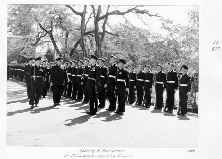 | Keywords: Queensland State Archives 4829 Opening of Parliament Sir John Lavarack inspecting Guard 1953.png en Opening of Parliament Sir John Lavarack inspecting Guard 1953 http //www archivessearch qld gov au/Image/DigitalImageDetails aspx ImageId 4829 Preferred citation Queensland State Archives Digital Image ID 4829 ID label 1292691 http //www archivessearch qld gov au/Search/AgencyDetails aspx AgencyID 1995 Lands Department Survey Office Cartographic Branch Photographic Section en Copyright expired Information field Decade 1950-1959 Information field Place en Brisbane City Information field Keywords en Guards of honour Opening ceremonies Information field Material Type en Photographic material Information field Type en Image PD-Australia QSA media uploaded by User 99of9 Photographic material from the Queensland State Archives 1953 in Queensland Parliament of Queensland Opening ceremonies Ceremonial guards John Lavarack |