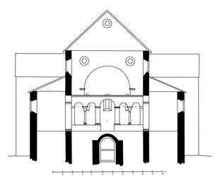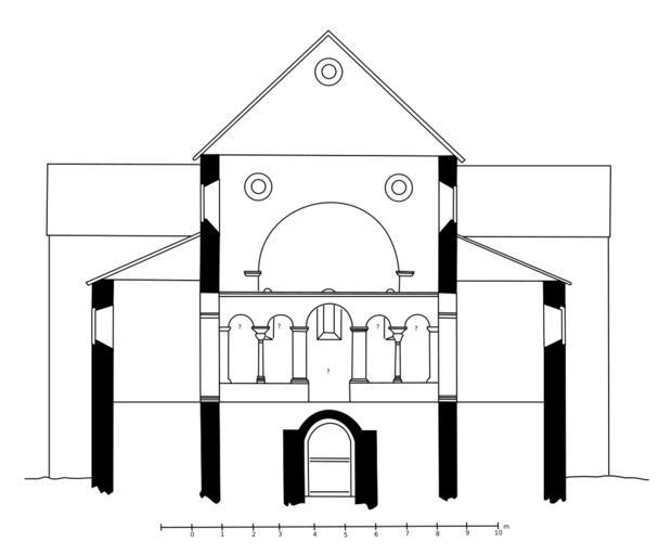 | Keywords: Querschnitt vor Chorschranke Rekonstruktion Müller.svg  en Cross section of the Einhardsbasilika at Steinbach Germany Einhardsbasilika Steinbach bei Michelstadt Hessen<br/> Aus Bild Querschnitt_vor_Chorschranke_Rekonstruktion_Müller jpg Die Rekonstruktionszeichnung zeigt den Querschnitt durch die Basilika mit Blickrichtung Osten vor der Chorschranke Die Fragezeichen in der Chorschranke bedeuten daß die genaue Gestalt der Chorschranke unklar ist Zu erkennen ist in der Bildmitte die Hauptapsis mit einem Rundbogenfenster sowie die Querschnitte durch die Seitenwände des Hauptschiffs der Seitenschiffe und eines Teils der Krypta hier der Mittelgang Richtung Osten Weiterhin ist die abgestufte Dachkonstruktion und der Blick auf die Westseite der Nebenchöre erkennbar own work based on de Bild Querschnitt_vor_Chorschranke_Rekonstruktion_Müller jpg by de Benutzer Capaci34 based on the dissertation of Dr Otto Müller 1937 MaEr 2008-08-24 49 41 15 N 08 59 48 E Plans of Einhardsbasilika Steinbach Reconstruction drawings of medieval buildings in Germany |