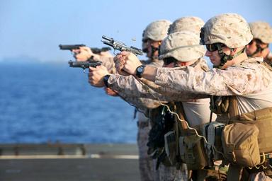 | Keywords: Quick Draw (8552860968).jpg Marines assigned to Battery B Battalion Landing Team 3/5 15th Marine Expeditionary Unit fire 9mm pistols during marksmanship training on the flight deck of USS Rushmore March 9 Using the M9 Beretta each shooter went through an entire course of fire on the paper targets The 15th MEU is deployed as part of the Peleliu Amphibious Ready Group as a U S Central Command theater reserve force providing support for maritime security operations and theater security cooperation efforts in the U S 5th Fleet area of responsibility U S Marine Corps photo by Cpl Timothy R Childers https //www flickr com/photos/marine_corps/8552860968/ Quick Draw 2013-03-09 07 25 https //www flickr com/people/40927340 N03 Marines from Arlington VA United States PD-USGov United States Marine Corps Official Page https //flickr com/photos/40927340 N03/8552860968 2016-09-03 22 33 52 United States Government Work 15th Marine Expeditionary Unit Marksmanship Sailors Amphibious forces Targets Weapon training in the United States Marine Corps M9 pistol cartridge ejections |