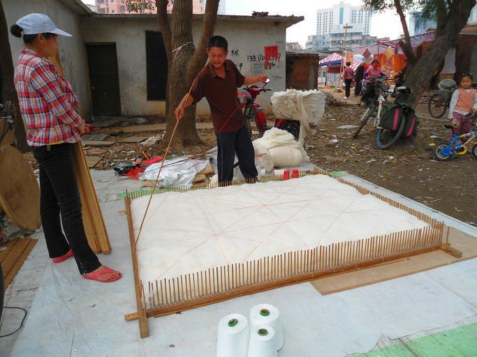 | Keywords: Quilt making 07.JPG en Blanket making in Haikou Hainan People's Republic of China A quilt maker covers the cotton batting with a lattice of thread The thread is fed through two holes at and near the tip of a long bamboo stick The stick is then used to loop the thread around the vertical pegs 2012-01-19 own Anna Frodesiak cc-zero Uploaded with UploadWizard Quilting in Haikou Files by User Anna Frodesiak Outdoor workers in China People at work in China | ||||