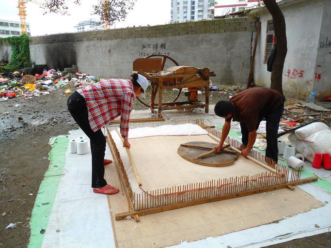 | Keywords: Quilt making 18.JPG en Blanket making in Haikou Hainan People's Republic of China A quilt maker presses a heavy wooden disk down onto the cotton batting in order to compact it 2012-01-19 own Anna Frodesiak cc-zero Uploaded with UploadWizard Quilting in Haikou Files by User Anna Frodesiak Outdoor workers in China People at work in China |