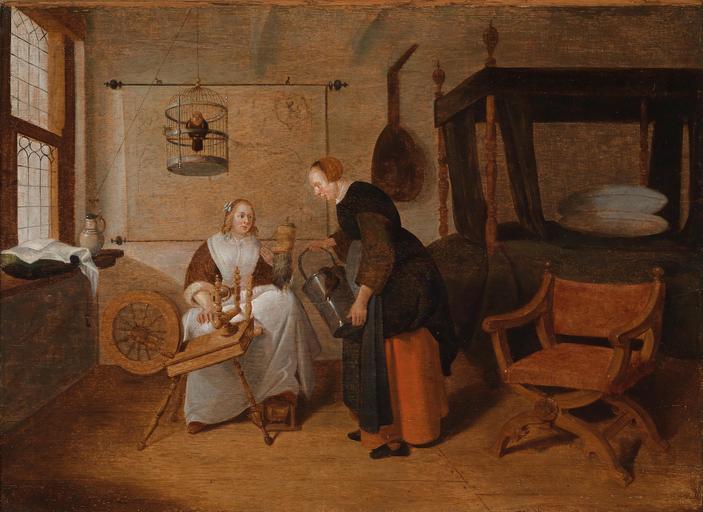 View Original:Quiringh_Gerritsz_van_Brekelenkam_Interieur_mit_einer_jungen_Frau_am_Spinnrad_und_einer_Magd.jpg (4288x3124)