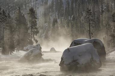 Keywords: outdoor landscape waterfall water "Christmas Tree Rock" in the Firehole River; Neal Herbert; January 2014; Catalog #19507d; Original #2396 "Christmas Tree Rock" in the Firehole River; Neal Herbert; January 2014; Catalog #19507d; Original #2396