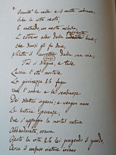 Keywords: giacomo leopardi giacomoleopardi naples italy text writing document "Il tramonto della luna" fu scritto da Leopardi con ogni probabilità nella primavera del 1836, durante il primo soggiorno a Torre del Greco, ed è forse l'ultimo dei canti leopardiani in successione cronologica, posteriore alla stessa "Ginestra", cui pur risulta anteposto nella sequenza dell'edizione Starita corretta. L'autografo è presso la Biblioteca Nazionale di Napoli e costituisce un inserto nell'edizione Starita appunto, su cui Leopardi apportò le correzioni e integrazioni definitive. "Il tramonto della luna" fu scritto da Leopardi con ogni probabilità nella primavera del 1836, durante il primo soggiorno a Torre del Greco, ed è forse l'ultimo dei canti leopardiani in successione cronologica, posteriore alla stessa "Ginestra", cui pur risulta anteposto nella sequenza dell'edizione Starita corretta. L'autografo è presso la Biblioteca Nazionale di Napoli e costituisce un inserto nell'edizione Starita appunto, su cui Leopardi apportò le correzioni e integrazioni definitive. |