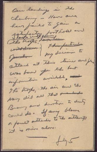 | Keywords: dwight d. eisenhower dwightdeisenhower narations blog narationsblog nara:arcid=186470 u.s. national archives usnationalarchives d-day dday eisenhower letter world war ii worldwarii normandy invasion text document writing From: Collection: Eisenhower, Dwight D: Papers, Pre-Presidential, 1916 - 1952 (Collection DDE-EPRE) Created by: Eisenhower, Dwight D. (Dwight David), 1890-1969 Production Date 06/05/1944 strong>Persistent URL: catalog.archives.gov/id/186470 Repository: Dwight D. Eisenhower Library (NLDDE) (Abilene, Kansas) Reproductions may be ordered via an independent vendor. The U.S. National Archives maintains a list of vendors at www.archives.gov/research/order/vendors-photos-maps-dc.html. Access Restrictions: Unrestricted Use Restrictions: Unrestricted Learn More: This item is featured on the National Archives' Online Public Access blog, NARAtions. Check out the post here to read about what Timothy Rives, Deputy Director of the Dwight D. Eisenhower Presidential Library, says this record tells us about Ike's character, the impartial nature of human frailty, and the need for archives! From: Collection: Eisenhower, Dwight D: Papers, Pre-Presidential, 1916 - 1952 (Collection DDE-EPRE) Created by: Eisenhower, Dwight D. (Dwight David), 1890-1969 Production Date 06/05/1944 strong>Persistent URL: catalog.archives.gov/id/186470 Repository: Dwight D. Eisenhower Library (NLDDE) (Abilene, Kansas) Reproductions may be ordered via an independent vendor. The U.S. National Archives maintains a list of vendors at www.archives.gov/research/order/vendors-photos-maps-dc.html. Access Restrictions: Unrestricted Use Restrictions: Unrestricted Learn More: This item is featured on the National Archives' Online Public Access blog, NARAtions. Check out the post here to read about what Timothy Rives, Deputy Director of the Dwight D. Eisenhower Presidential Library, says this record tells us about Ike's character, the impartial nature of human frailty, and the need for archives! |