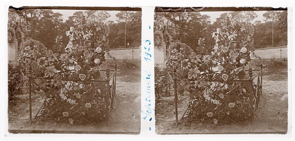 Keywords: grave death floral tribute flowers france public domain publicdomain abstract photo border monochrome text outdoor texture tree plant Possibly the most elaborate floral tribute that I have ever seen on a grave. Whilst there are no clues as to who this may be for (other than someone's father) the neighbouring gravestone has: "???? Forest Veuve GEORGE 1835-1914 Victor VINCENT Decede [died] le 3 Juin 1922 a l'age de 62 ans" This comes from the same batch of French stereoviews, so is likely to be either Fontainebleau or Normandy. The more I think of this, the more I realise that if this is the grave of the photographers father, or at least a close relative, this may be the one and only chance we have of identifying some of the other people in the set (more portraits from the batch to follow shortly) Possibly the most elaborate floral tribute that I have ever seen on a grave. Whilst there are no clues as to who this may be for (other than someone's father) the neighbouring gravestone has: "???? Forest Veuve GEORGE 1835-1914 Victor VINCENT Decede [died] le 3 Juin 1922 a l'age de 62 ans" This comes from the same batch of French stereoviews, so is likely to be either Fontainebleau or Normandy. The more I think of this, the more I realise that if this is the grave of the photographers father, or at least a close relative, this may be the one and only chance we have of identifying some of the other people in the set (more portraits from the batch to follow shortly) |