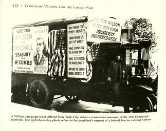 Keywords: president wilson campaign monochrome Local Accession Number: 2157 Description: Caption reads: "A Wilson campaign truck offered New York City voters a convenient summary of the 1916 Democratic platform. The eight-hour-day plank refers to the president's support ro a federal law for railroad workers." Photographer: Unknown Source: Unknown Size: 8x10 Medium: Print, Black and White Date: 1916 Local Accession Number: 2157 Description: Caption reads: "A Wilson campaign truck offered New York City voters a convenient summary of the 1916 Democratic platform. The eight-hour-day plank refers to the president's support ro a federal law for railroad workers." Photographer: Unknown Source: Unknown Size: 8x10 Medium: Print, Black and White Date: 1916 |