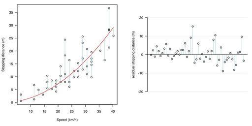 | Keywords: R-car stopping distances 1920+quadratic.svg en A simple graph of car stopping distances with a simple quadratic zero intercept fit and residual plot Own HYanWong 2008-12-13 Created with R using the following commands <pre>svg R-car_stopping_distances_1920+quadratic svg 8 4 8 layout t 1 2 par mar c 5 4 1 2 + 0 1 cars speed kph <- cars speed 1 609344 cars dist m <- cars dist 0 3048 plot dist m ~ speed kph data cars xlab Speed km/h ylab Stopping distance m las 1 quad model <- lm dist m~I speed kph 2 -1 data cars curve quad model coef1 x 2 col red add TRUE segments cars speed kph fitted values quad model cars speed kph fitted values quad model +residuals quad model col lightblue par mar c 5 5 1 1 + 0 1 plot residuals quad model type h ylim c -25 25 bty n xaxt n las 2 xlab NA ylab residual stopping distance m col lightblue grid NA NULL abline h 0 points residuals quad model dev off </pre> Uncategorized 2015 March 23 |