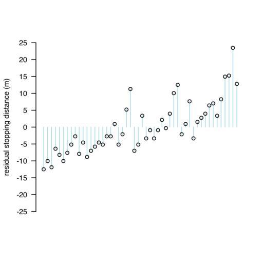 | Keywords: R-car stopping distances 1920+null-resids.svg en A plot of residuals from a null linear model fit of car stopping distances Own HYanWong 2009-01-19 Created with R using the following commands <pre> svg R-car_stopping_distances_1920+null-resids svg 4 4 8 plot residuals null model type h ylim c -25 25 yaxp c -25 25 10 bty n xaxt n las 2 xlab NA ylab residual stopping distance m col lightblue points residuals null model dev off </pre> Uncategorized 2015 March 23 | ||||
