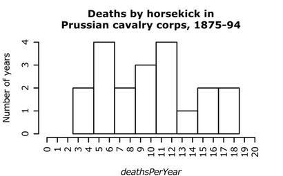 Keywords: R-horsekick totals-histogram.svg en Histogram example with discrete data Data von Bortkiewicz's famous dataset of deaths by horse kick in Prussian cavalry corps own HYanWong 2009-03-06 Created with R using the following commands <pre> svg file R-horsekick_totals-histogram svg width 4 height 2 5 pointsize 8 Histogram example with discrete data Data von Bortkiewicz's famous dataset of deaths by horse kick in Prussian cavalry corps library pscl par mar c 4 4 4 2 +0 1 X <- tapply prussian y prussian year sum h <- hist X breaks seq 2 5 18 5 by 2 xlim c 0 20 xlab expression italic deathsPerYear xaxt n ylab Number of years main Deaths by horsekick in\nPrussian cavalry corps 1875-94 axis 1 0 20 las 2 dev off </pre> Histograms |